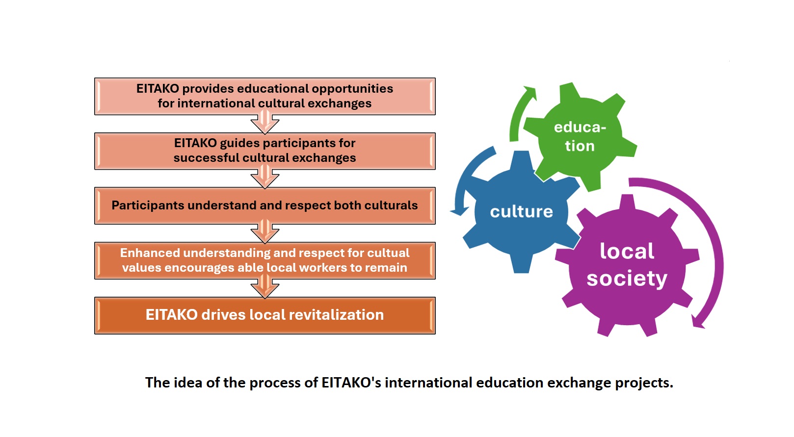 EITAKO runs 2 regular projects. One is the EITAKO School Cultural Exchange, and the other project is Traditional Cultural Exchanges. Both projects are done between Okayama Prefecture, Japan and New Zealand. EITAKO aims to connect the local network operating the two projects as below.
