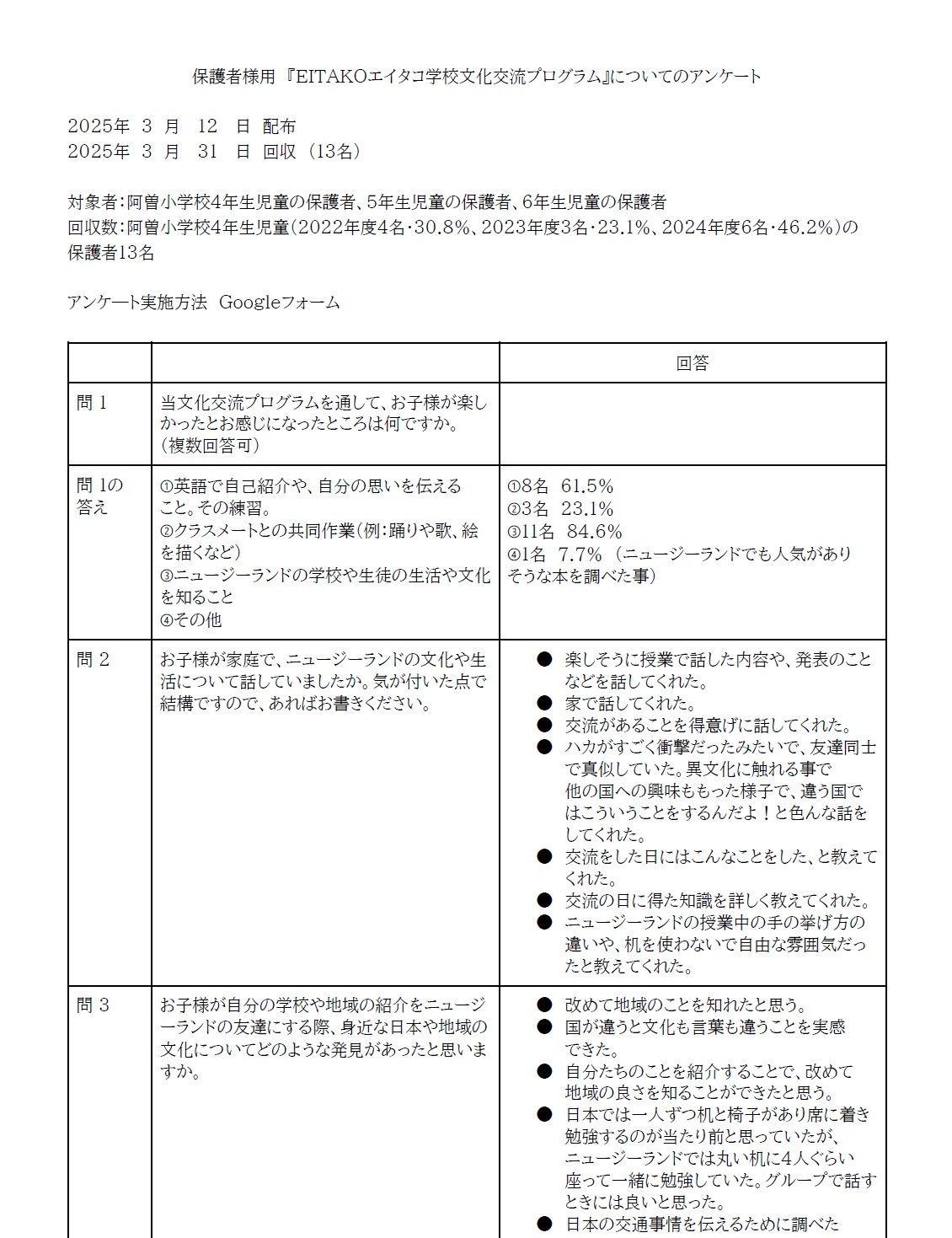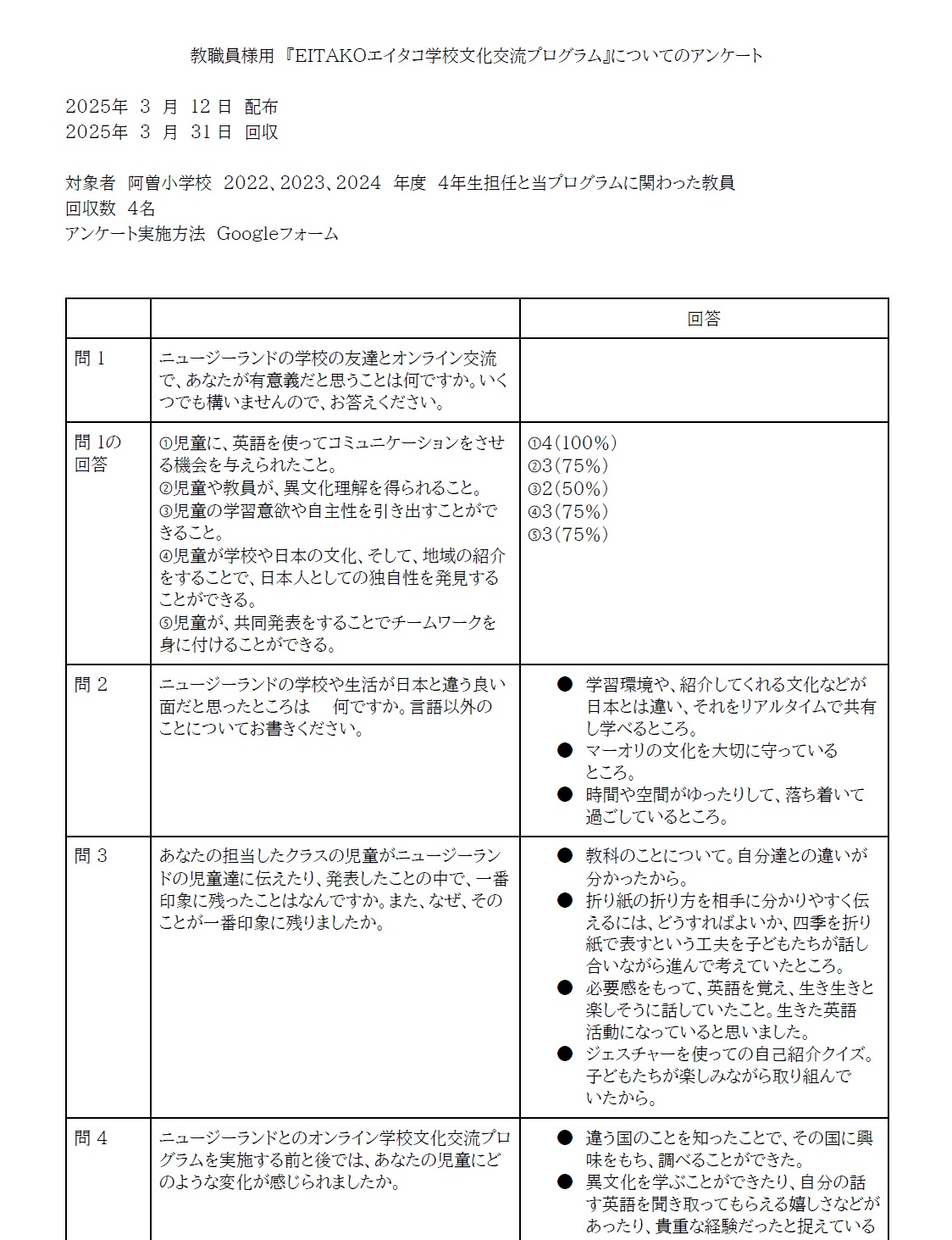 - EITAKOの交流プログラムが教育的にどのように効果があるか、阿曽小学校を通してアンケートを実施した。集計結果は下記の通りである。