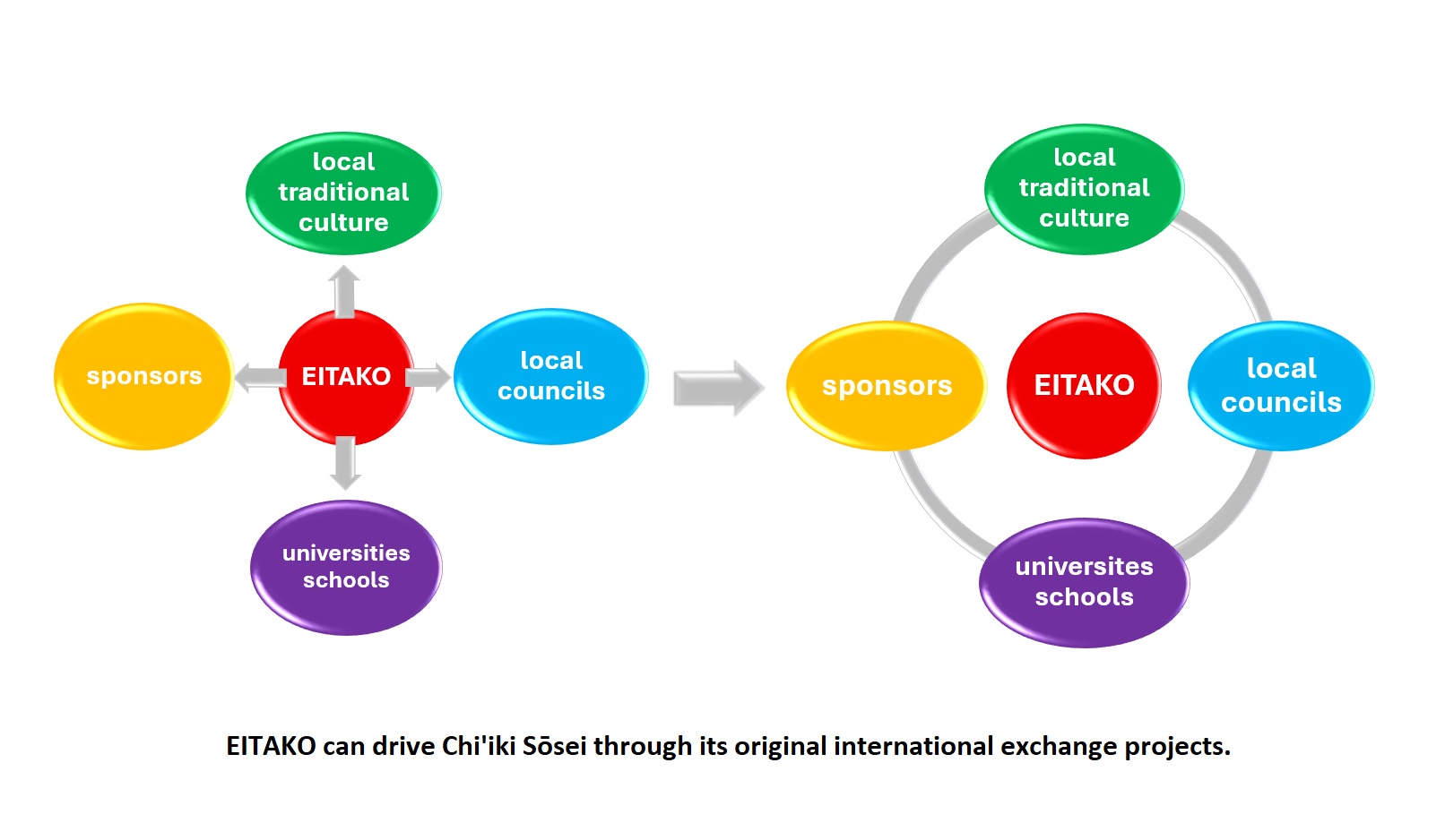 EITAKO runs 2 regular projects. One is the EITAKO School Cultural Exchange, and the other project is Traditional Cultural Exchanges. Both projects are done between Okayama Prefecture, Japan and New Zealand. EITAKO aims to connect the local network operating the two projects as below.
