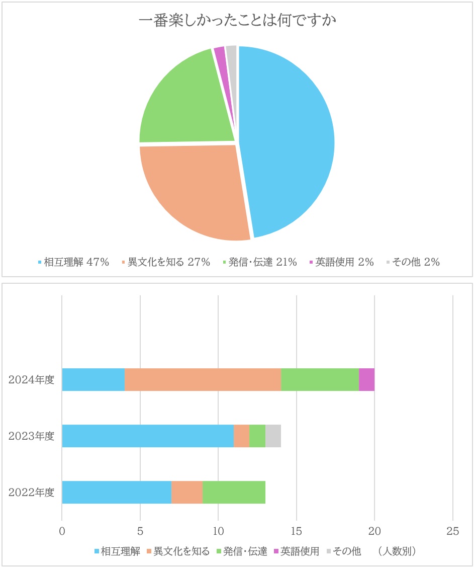 - 相互理解:例)名前当てゲームでお互いの名前を覚えたり、お互いのことについてクイズを出し合ったりして理解し合うことが楽しかった。