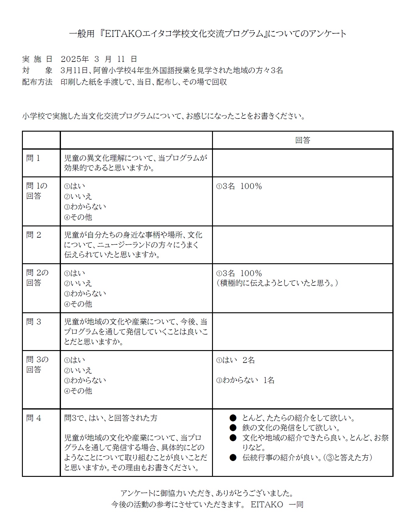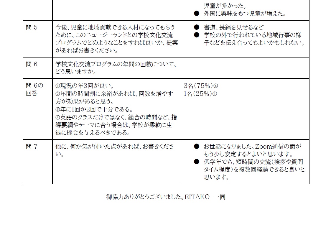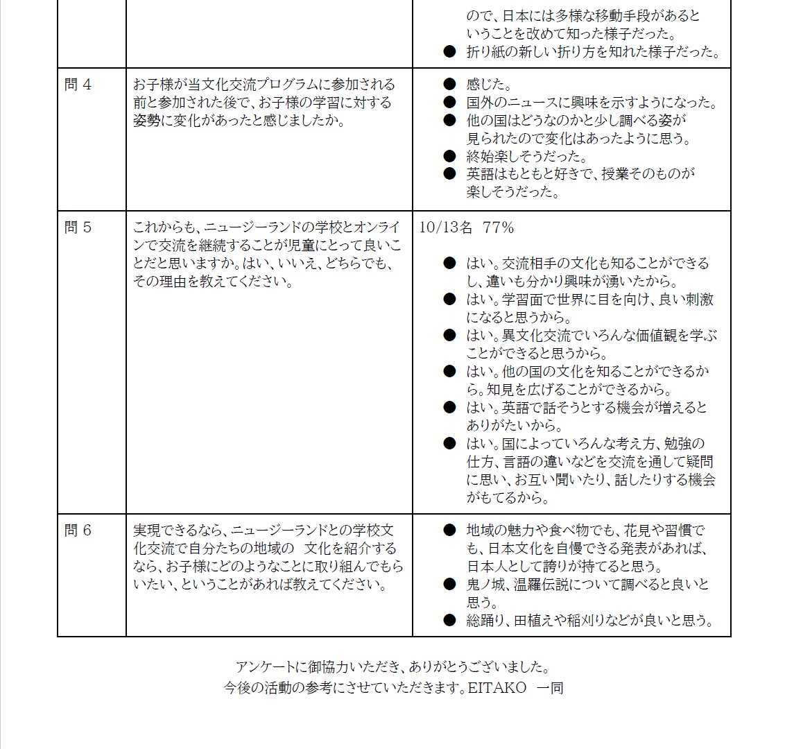 - EITAKOの交流プログラムが教育的にどのように効果があるか、阿曽小学校を通してアンケートを実施した。集計結果は下記の通りである。